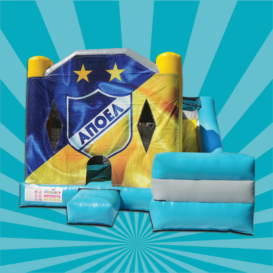 Φτιάξτε την εορταστική ημέρα των μικρών ποδοσφαιρόφιλων με το φουσκωτό ΑΠΟΕΛ! Το φουσκωτό αυτό είναι ο καλύτερος τρόπος διασκέδασης για οποιαδήποτε περίσταση πάρτυ γενεθλίων ή εκδήλωσης αφού διαθέτει μεγάλο χώρο για να χοροπηδούν τα παιδιά ως επίσης και μεγάλη τσουλήθρα!